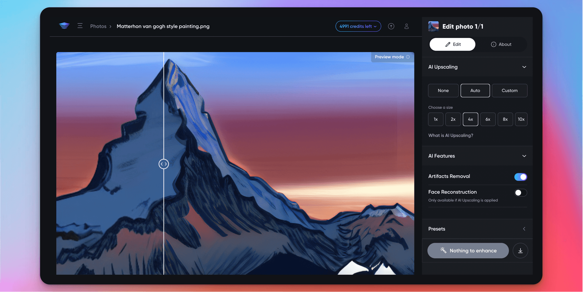 The comparison between the original and upscaled versions demonstrates that even though it might not be immediately obvious on screen, there are a lot of nuanced differences in the look of the two renderings. However, in the field that we operate, this difference is huge. When a person wants to hang this "Van Gogh Matterhorn" as a large print on the wall of their home, high quality is required to avoid disappointment.